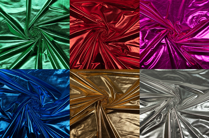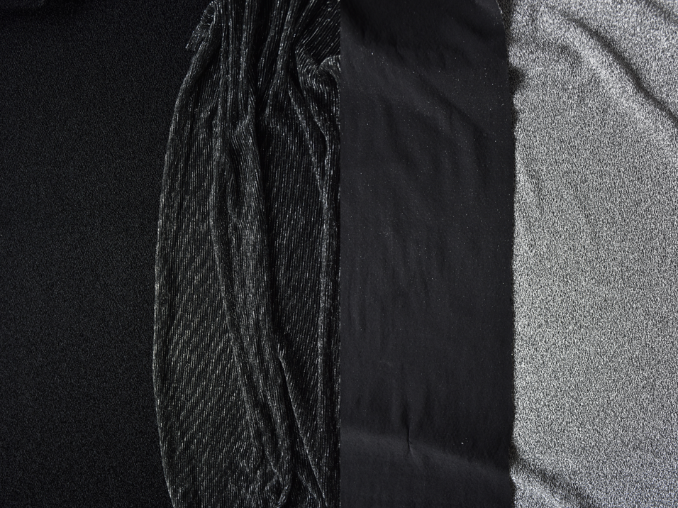 Für die Bühne und passend zur Vorweihnachtszeit: Metallicstoffe. Der 2. von links ist transparent und kann als Oberstoff über schwarzem Stoff oder als Einsatz wie Mesh verarbeitet werden. Der schwarze und der silberne Stoff glitzern wunderbar und haben eine angenehm weiche Innenseite (3.von links)